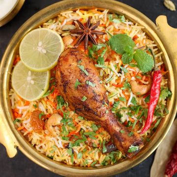 Fragrant basmati rice layered with tender chicken, slow-cooked (“dum” style) with aromatic spices, saffron and herbs for a rich, authentic flavour