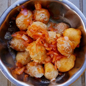 Hash browns topped with onion, pickled cucumber, Pickled Chilli, Radish, finished with a drizzle of cheese Sauce.